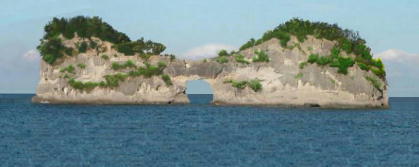 形の穴がぽっかり開いていることから「円月島」と呼ばれ親しまれています。